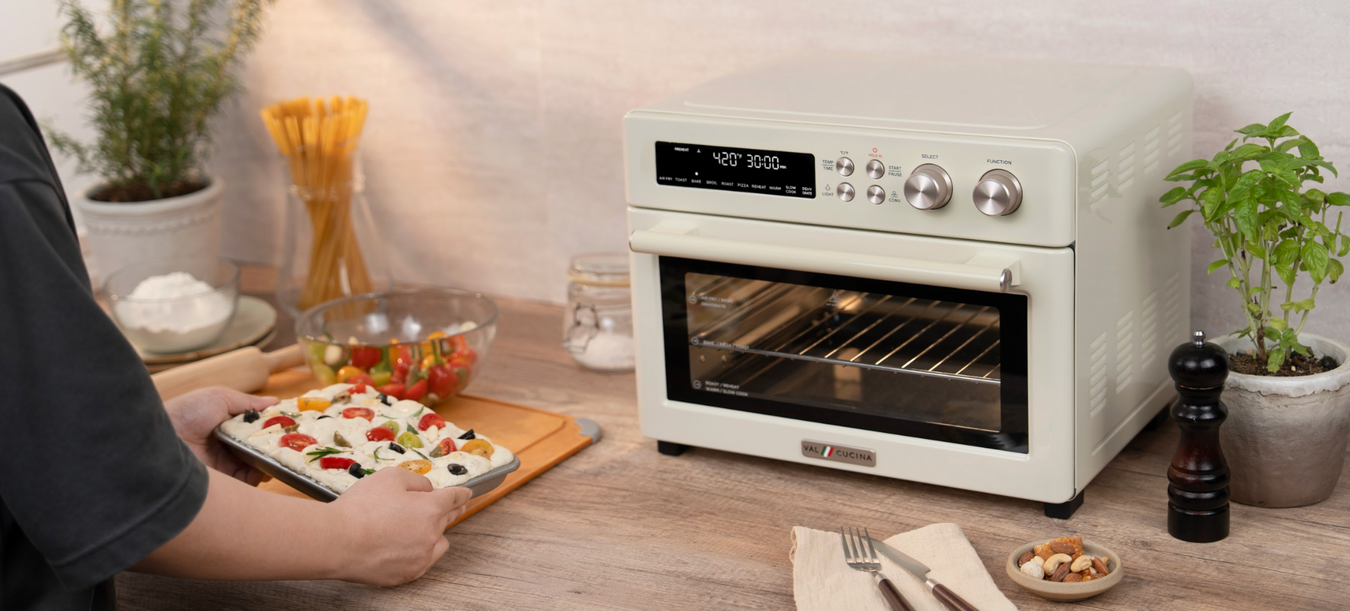 This large air fryer toaster oven combines retro air fryer oven charm with modern engineering-- delivering quick preheating, precise temperature control and 10-in-1 functionality, all in one sleek unit.