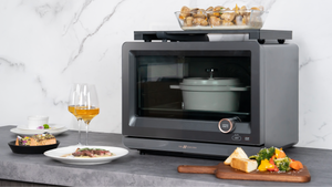 A: Because it does what neither can. This oven steams, crisps, roasts, and sanitizes — all faster, using less energy, and with better tasting results. It’s healthier, more versatile, and better looking on your counter.
